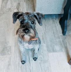 Annie is a silver schnauzer. She is an outgoing, social dog that is always begging for love and loves nothing more than playing with kids.